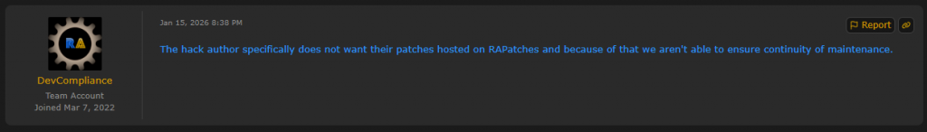 Even if the patch wasn’t hosted on RAPatches, the second part of the statement doesn’t follow from the first. Game roms are not cloned into the repo. That would be illegal, just like cloning hack patches without hack author permission is allegedly. But game achievement sets stay up. Why?