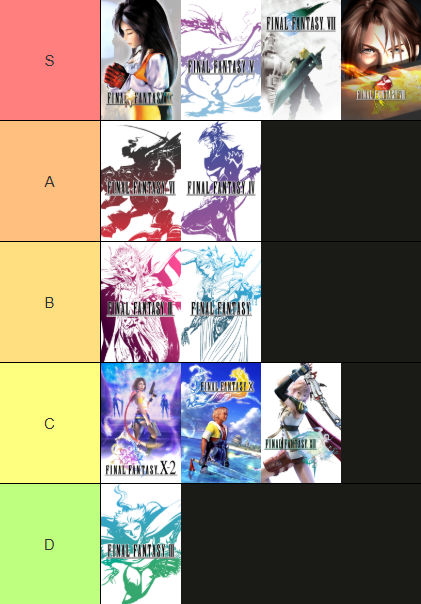 I just rank 4-6 at the very top, along with tactics [and dimensions]. 10 is just right behind those [and tactics a2]. Favorite PS1 FF is 9, least favorite is 8. NES trilogy I rate above PS1 trilogy but I’m still not a particularly big fan of those. Though I do love 2’s story and characters.