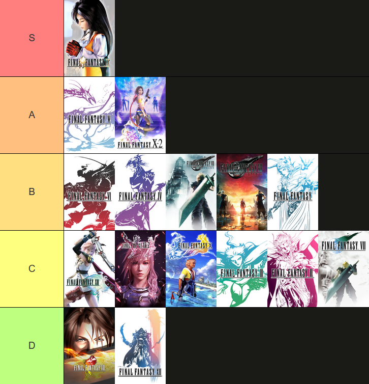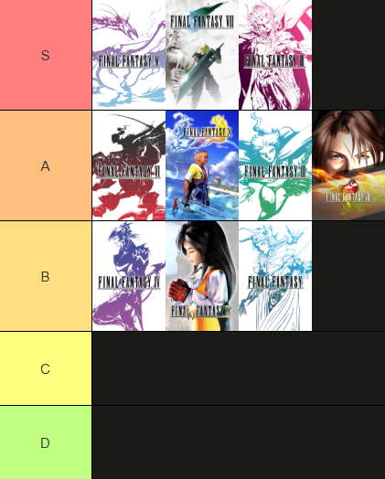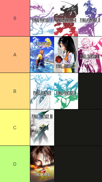 NES trilogy I rate above PS1 trilogy but I’m still not a particularly big fan of those. Though I do love 2’s story and characters.9 falls apart by like, the last boss fight. 7 falls apart at the last disc. And 8 falls apart after like, the intro lol. ….