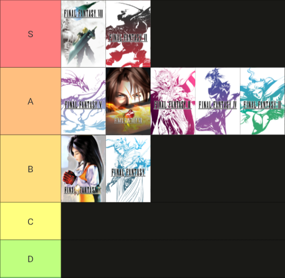 NES trilogy I rate above PS1 trilogy but I’m still not a particularly big fan of those. Though I do love 2’s story and characters.9 falls apart by like, the last boss fight. 7 falls apart at the last disc. And 8 falls apart after like, the intro lol. ….