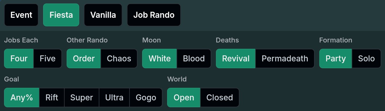 Unlike traditional FJF, Whirlwind Fiesta allows each character to get his or her own four job rolls, for a total of sixteen rolls. This is called the “Four Jobs Each” style of Fiesta.