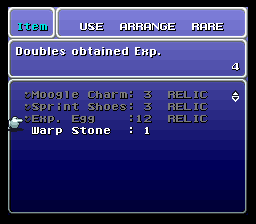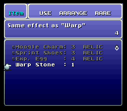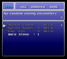 Amount of each of Moogle Charm and Sprint Shoes as starting items increased from one to three. Purpose is to equip all three of your parties for dungeons like Kefka’s Tower.