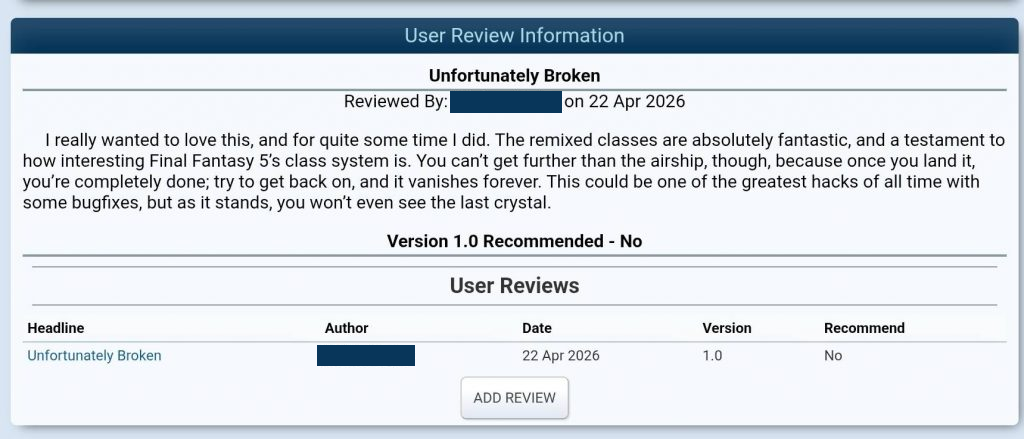 Instead of checking the instructions or asking for assistance, our player leaves a review concluding the hack is “unfortunately broken,” when maybe it’s the player who unfortunately won’t read.