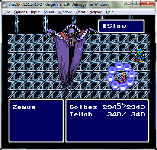 Now here is where things get interesting... it doesn't appear to load FuSoYa per se but loads what is in the 1st Shadow Slot. If you start the game and go straight for the Zemus fight Golbez will be fighting alone in a cycle of Fire 3, Ice 3, Lit 3, W. Meteo. Say if you add and immediately remove Tellah 1 from your party he will be fighting along Golbez in the Zemus fight because he is the actor currently in the 1st Shadow Slot.