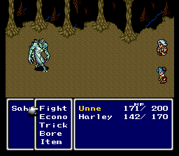 Unne's abilities: Econo is an improved Salve; Trick is an improved Recall (randomly cast any one of eight debuffs/status ailments on all enemies); Bore is a modified Cry (Sleep on all enemies, costs no MP). The idea is that Unne is a rather long-winded teacher but he's also a bit of a wily politician who can pull one over on you.