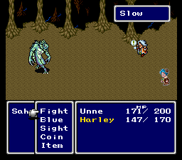Here's Unne performing Trick and coming up with Slow, and you can see Harley's abilities. Only Sight will be unlocked when you start, but they're all available here for testing purposes. Blue Magic spells are learned through events, and Gil Toss will be taught to her by a later party member.