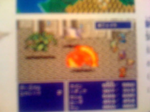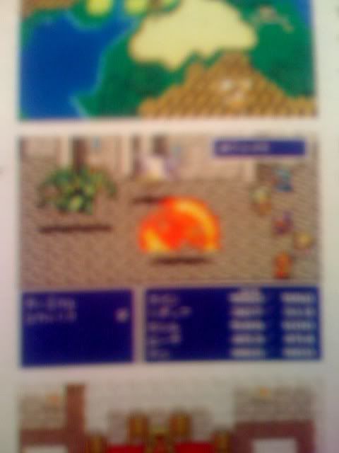 let me explain what is going on in case you can't make them out. they are of the same image on the original ff4j box. i can't remember the monsters' names, but i can describe them. one is a green "gargoyle" with wings, and there are 2 "birds", maybe "eagles"? as i said, i can't recall the names. anyway, the odd part is that they're fighting in the castle setting, like when you defend the castle with yang, edward/gilbert, and cecil. in the picture, it seems that rydia is casting fire(2?) on an eagle creature. here is your party with their hp levels: