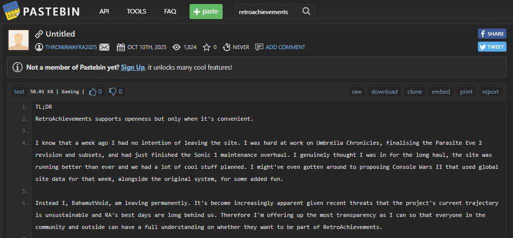 Instead I, BahamutVoid, am leaving permanently. It’s become increasingly apparent given recent threats that the project’s current trajectory is unsustainable and RA’s best days are long behind us. Therefore I’m offering up the most transparency as I can so that everyone in the community and outside can have a full understanding on whether they want to be part of RetroAchievements.