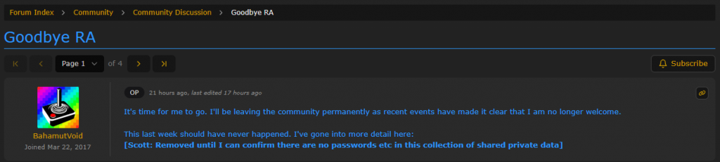 So, I’ve decided to burn this bridge. I have been unhappy in the community for some time and there were always things that didn’t seem fair or right. We are a contribution project, often guided by those who only passively consume or benefit adjacently. We dictate how to participate, and gatekeep those who don’t fit into the admittedly flimsy documentation. We actively encourage the site to have unchecked growth without caring if it’s sustainable. There will never be enough contributors to match the ideal that people expect RA to be, seeing it instead as a service. As has been mentioned by plenty, this was “bound to happen at some point”. But that doesn’t make it okay, or unavoidable.